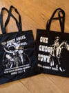 Black canvas tote bags with a different design on each side, for your carrying needs during the impending apocalypse. Forget those single-use plastic bags. Look stylish and don't lose your shit.